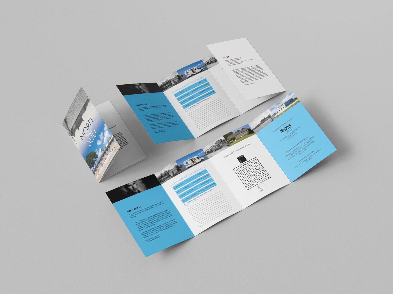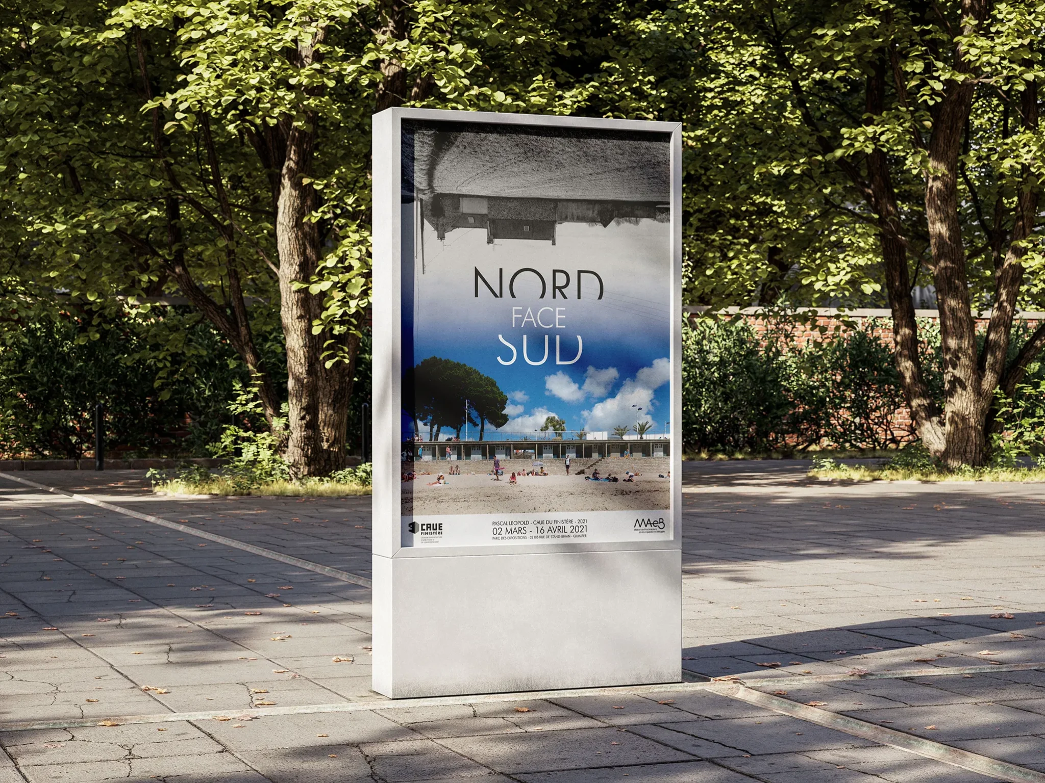 Ce projet a été réalisé durant ma première année de DN MADe en collaboration avec deux élèves de deuxième année. Pour l’exposition photographique « FACE NORD / FACE SUD » présentant des clichés de Pascal Léopold, il nous a été demandé de réaliser l’affiche de l’exposition. Les seules contraintes étant d’utiliser la typographie Futura et de réunir les deux document en un seul. C’est à dire qu’une fois complètement déplié, on retrouvait l’affiche au dos du dépliant.