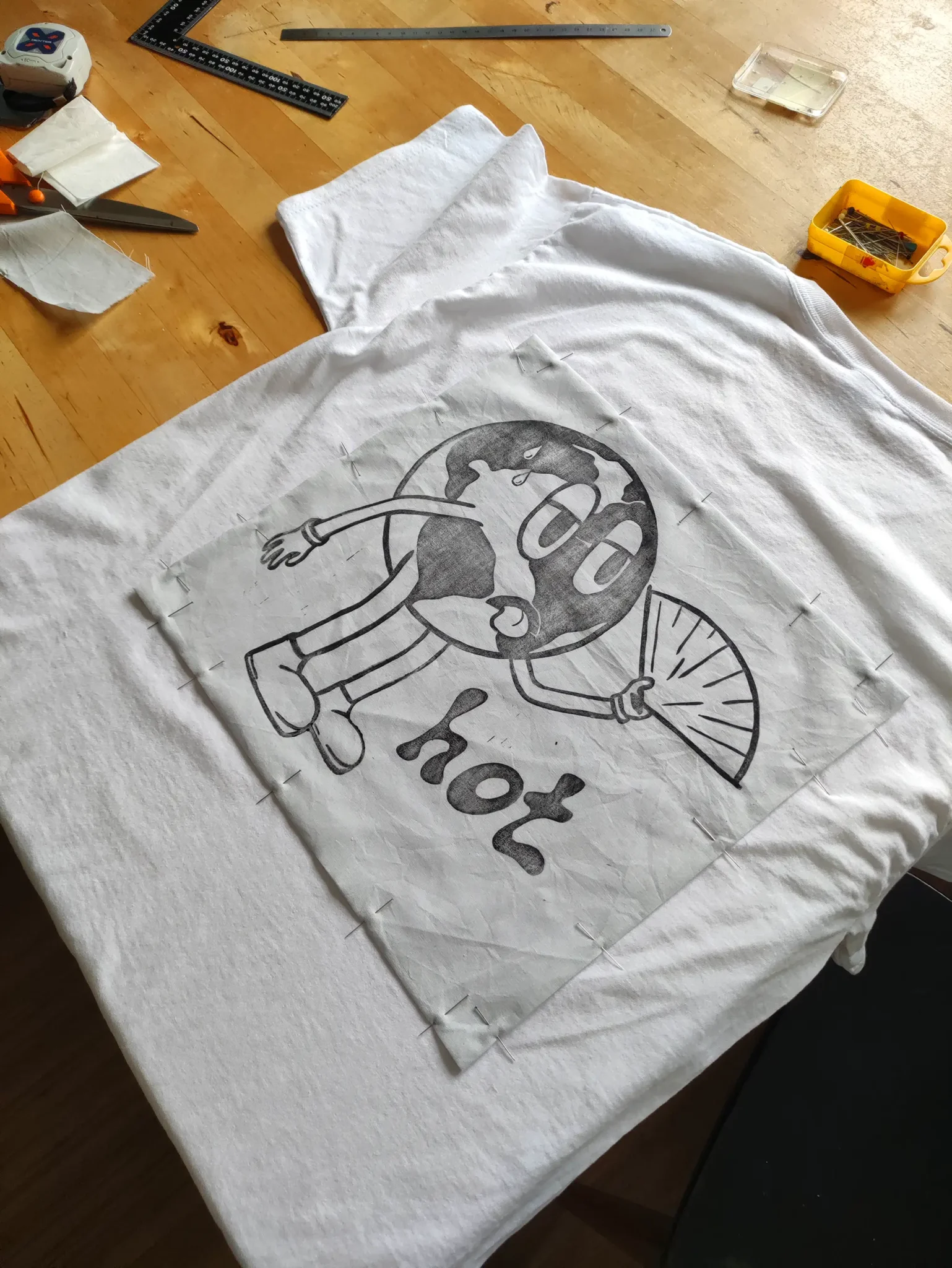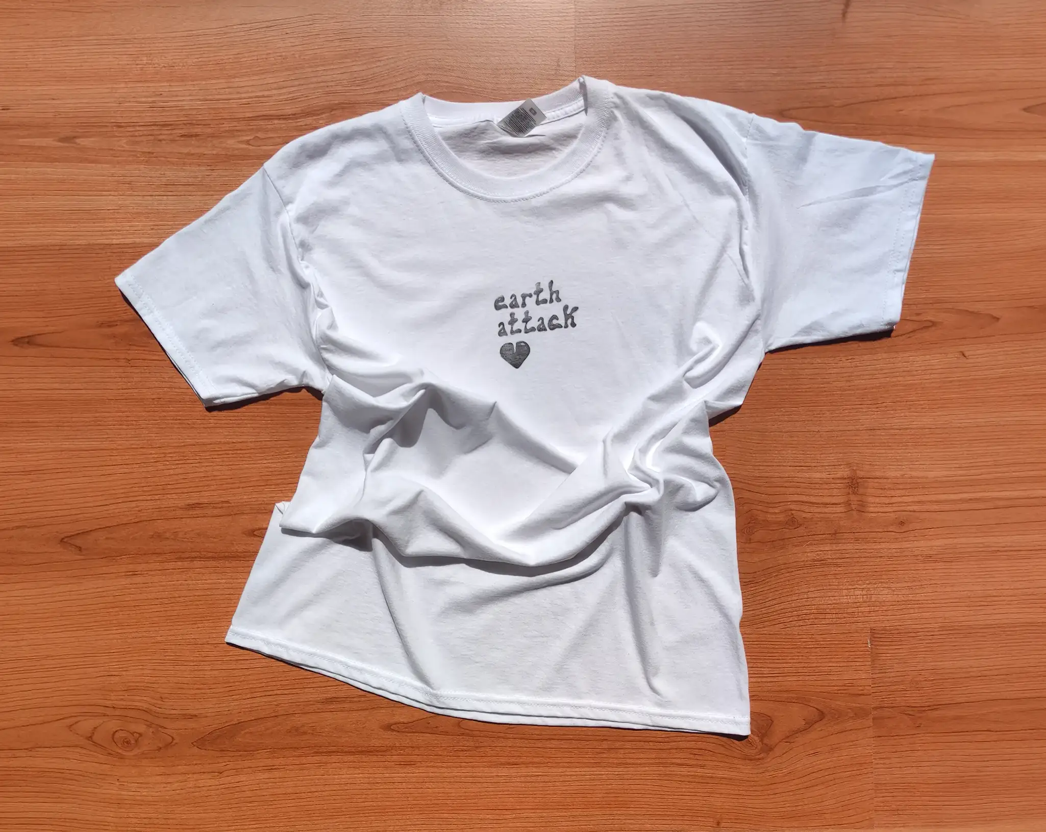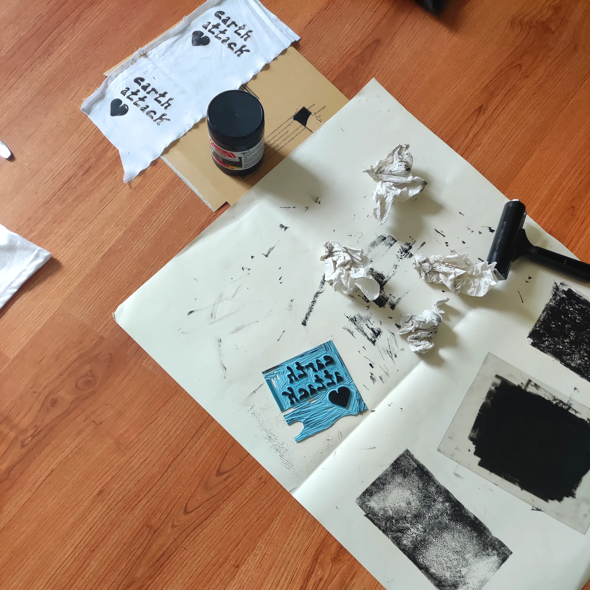 Dans une démarche de développement durable et afin de transmettre un message engagé, j’ai récupéré des chutes de tissus aux Emmaüs de Quimper et j’y ai imprimé mes visuels en linogravure puis les ai cousus à la machine sur des t-shirts.