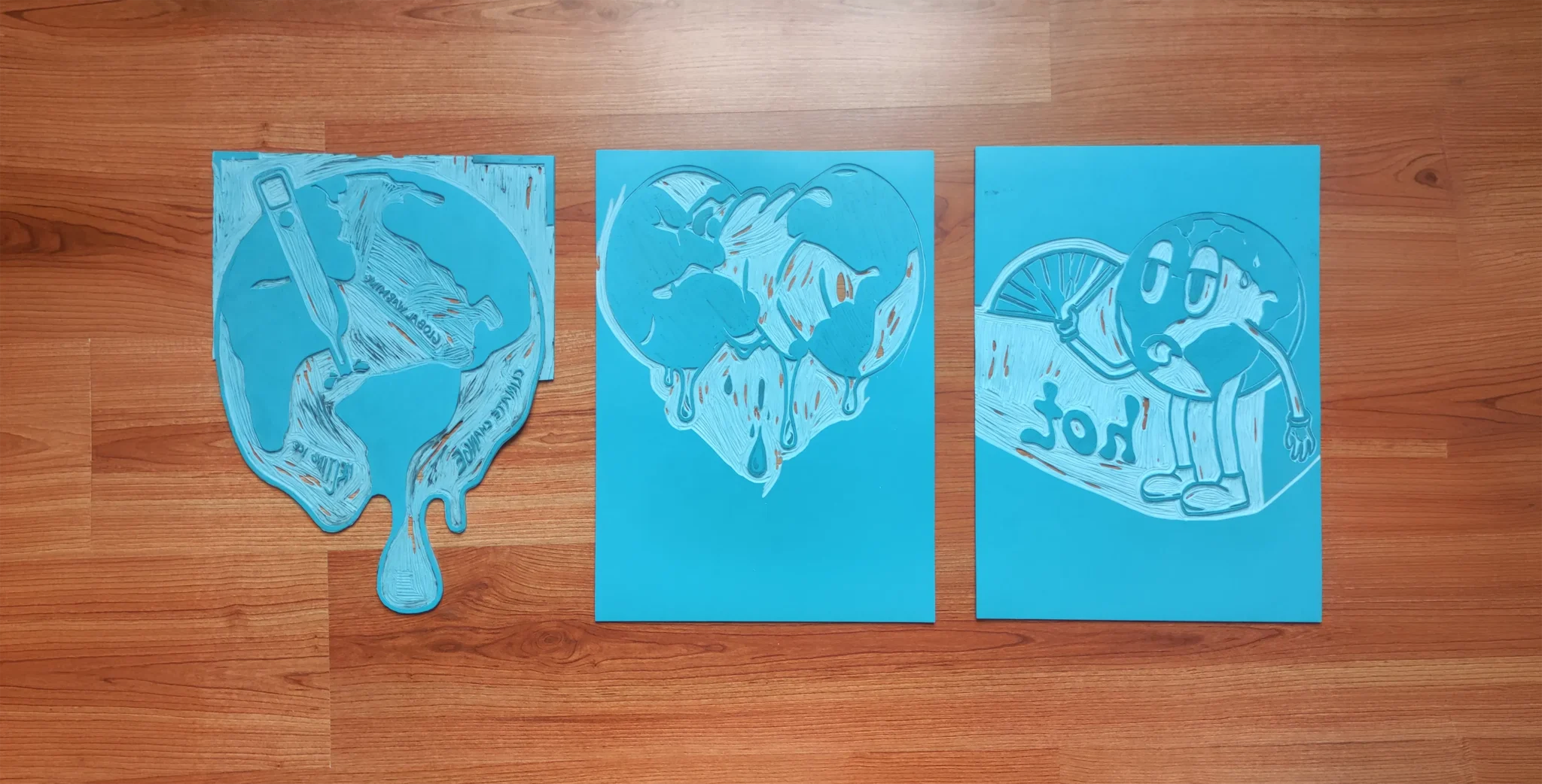 Les plaques de lino ont été gravées manuellement et l’impression s’est faite à la cuillère.